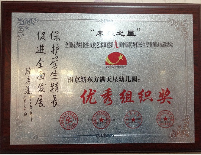 2012年评为南京市优质幼儿园依据幼儿教育发展的要求,优质幼儿园评估标准对幼儿园园长任职条件提出了学历、资格和能力要求。这一标准源于、高于《幼儿园工作条例》和《幼儿园工作规程》对园长任职资格的要求,适应了江苏教育现代化建设对幼儿教育的新要求,表明我园成为南京市优秀的园所之一。